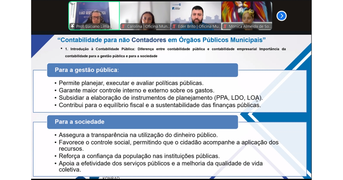 Nos dias 4 e 5 de setembro, a Oficina Municipal e a Fundação Konrad Adenauer (KAS-Brasil) promoveram mais uma atividade formativa dentro do calendário virtual voltado aos consórcios parceiros e demais interessados na gestão pública municipal. O curso “Contabilidade para Não Contadores em Órgãos Públicos Municipais”, conduzido pelo professor Luciano de Lima, reuniu mais de 100 participantes de diversas regiões do país.