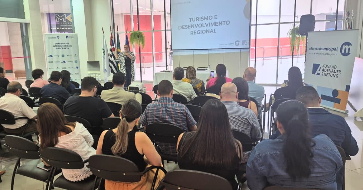 No dia 12 de fevereiro de 2026, a sede do COINTRI, em Taubaté (SP), recebeu o I Seminário Regional de Desenvolvimento Econômico, realizado pelo Consórcio Intermunicipal Três Rios, com coordenação técnica da Oficina Municipal e apoio da Fundação Konrad Adenauer (KAS Brasil). Ao longo do dia, o evento reuniu servidores e gestores públicos para uma formação presencial com certificado, organizada em três eixos que conversam e cobram coerência entre si: turismo, reforma tributária e desenvolvimento econômico sustentável.